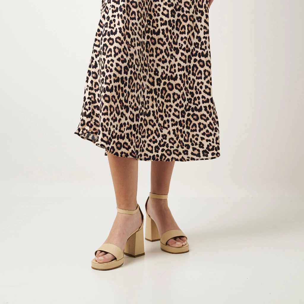 Taco: recto de 9cm de alto y 2cm de plataforma, forrado en el mismo cuero que la capellada